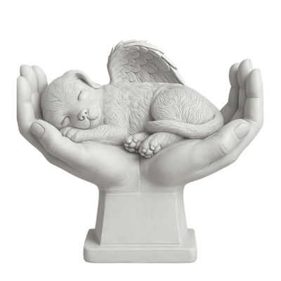 🤍 Raffigura un cane angelo sereno adagiato tra mani scolpite, simbolo di pace e cura eterna