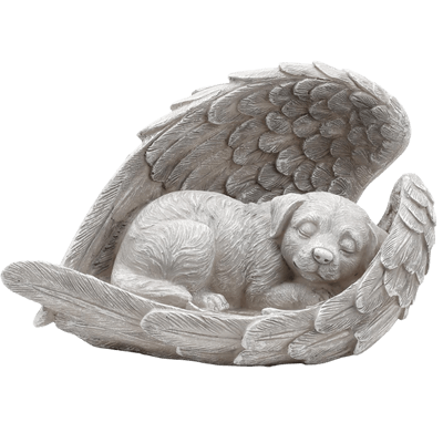 🤍 Raffigura un cane in posizione di riposo con ali d’angelo e testo commemorativo inciso