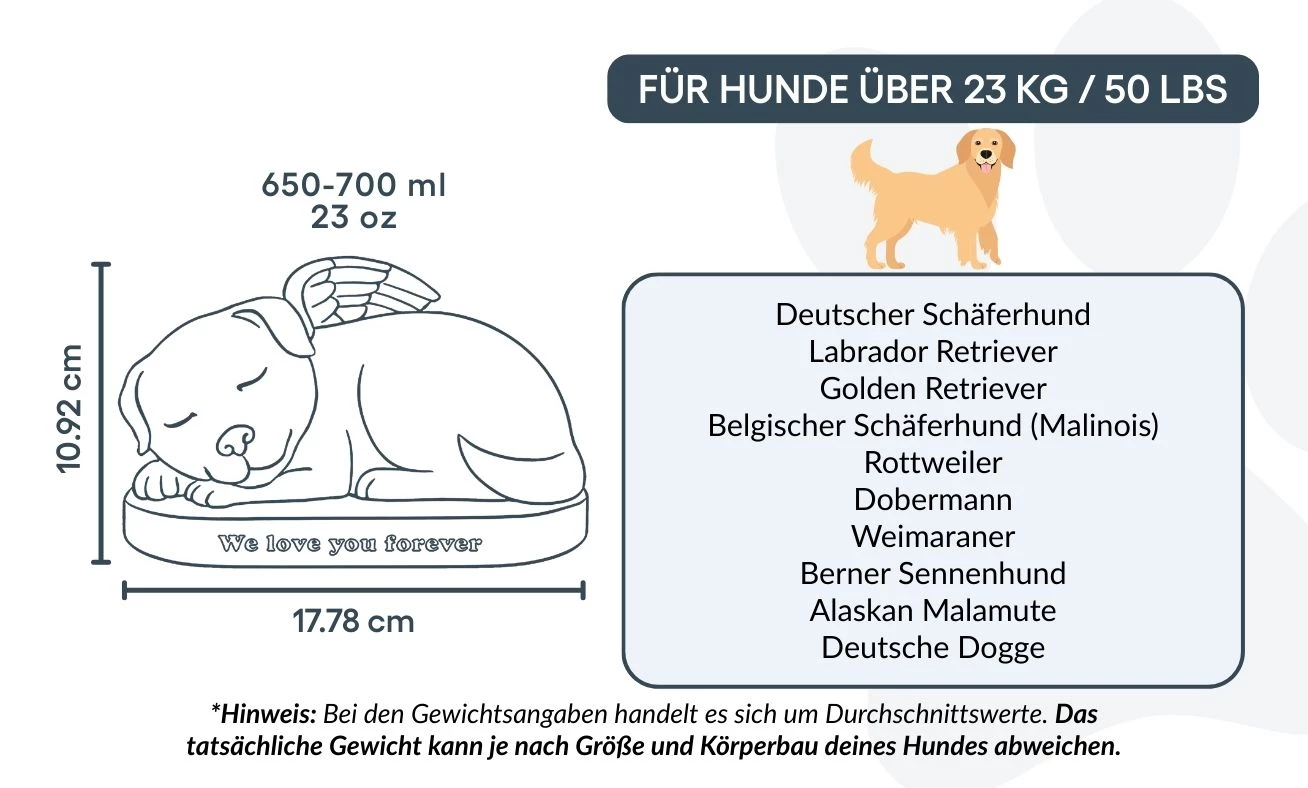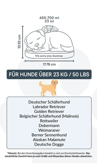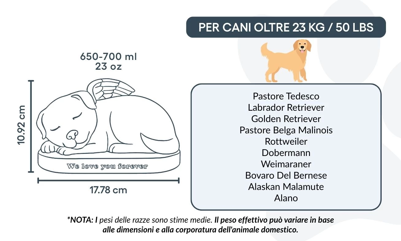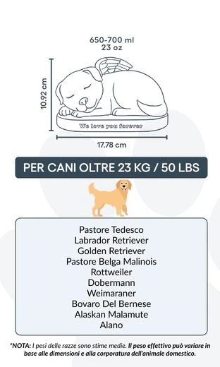 Nota: Le capacità indicate si basano su stime medie della cremazione degli animali. Si consiglia di considerare il peso e la corporatura del proprio cane nella scelta dell’urna.