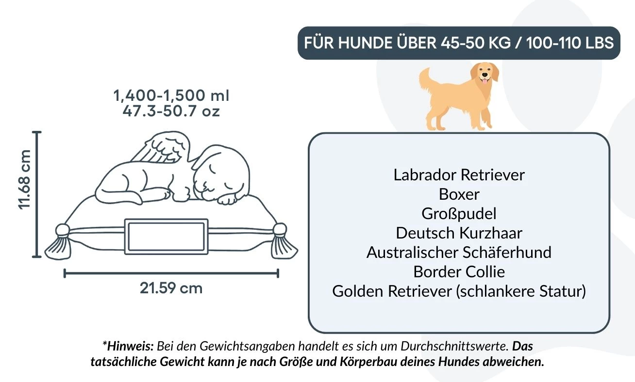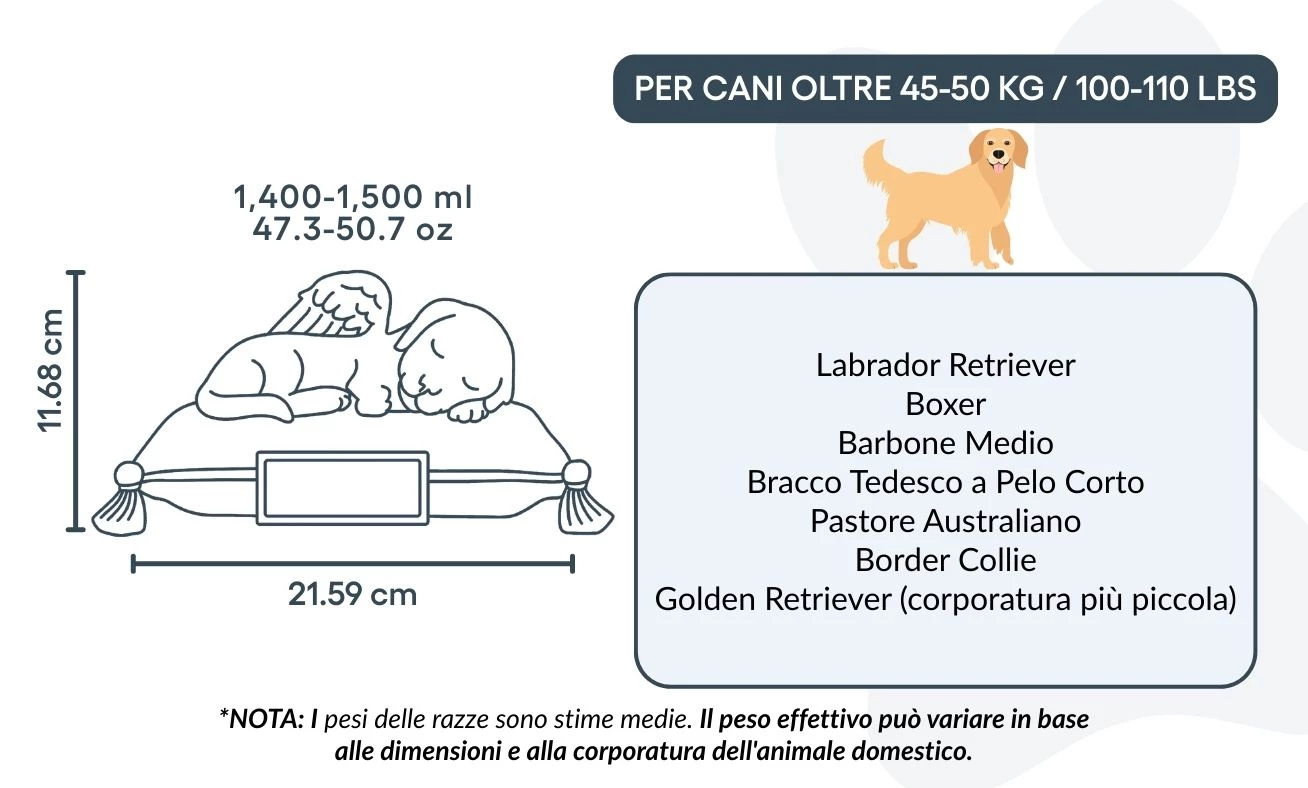 Nota: Le capacità indicate si basano su stime medie della cremazione degli animali. Si consiglia di considerare il peso e la corporatura del proprio cane nella scelta dell’urna.