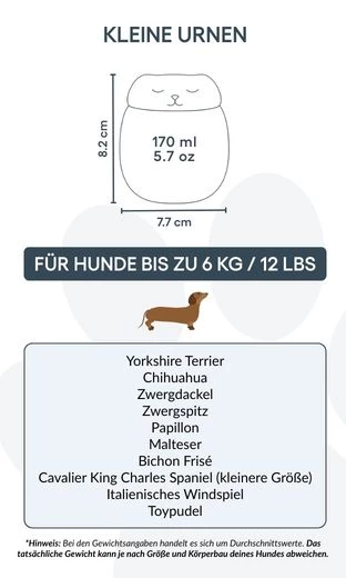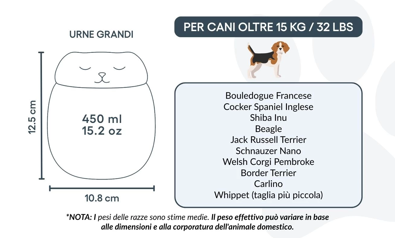Ideale per la cremazione degli animali, la conservazione delle ceneri e l’uso come memoriale interno, questa urna ricordo aiuta a preservare i momenti più preziosi. È molto più di un contenitore: è un’urna personalizzata per animali che racconta la storia del tuo cane con dignità.